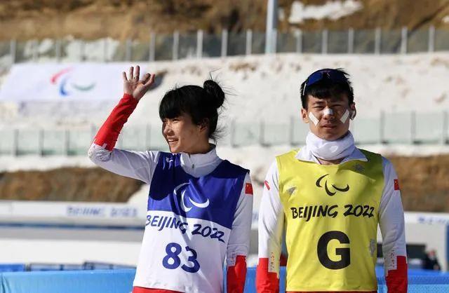 △3月8日,在殘奧冬季兩項(xiàng)女子中距離(視障)比賽后,王躍(左)向現(xiàn)場(chǎng)觀眾致意。