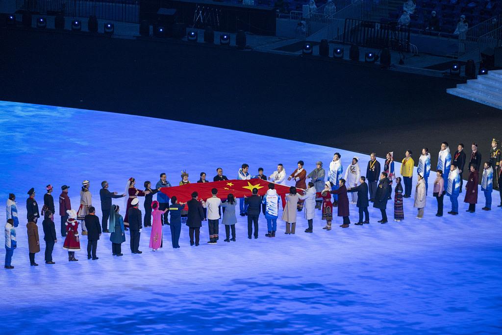 △2月4日,2022北京冬奧會(huì)開(kāi)幕式在國(guó)家體育場(chǎng)舉行。鳥(niǎo)巢中央,一面五星紅旗在12位小朋友手中徐徐展開(kāi)。隨后,他們將國(guó)旗傳遞給176名代表。
