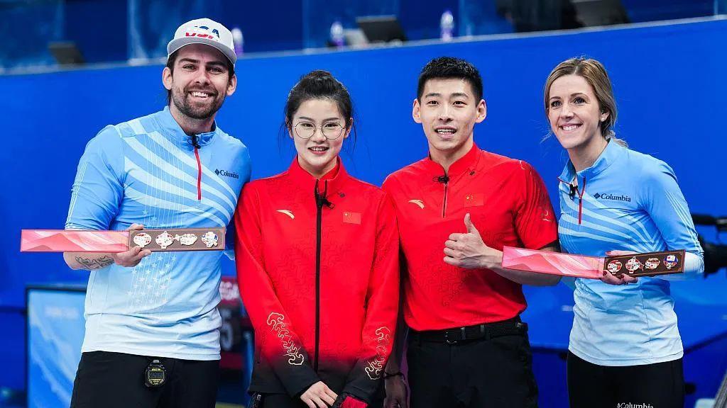 △北京冬奧會(huì)冰壺混合雙人循環(huán)賽后,中國(guó)隊(duì)與美國(guó)隊(duì)合影。