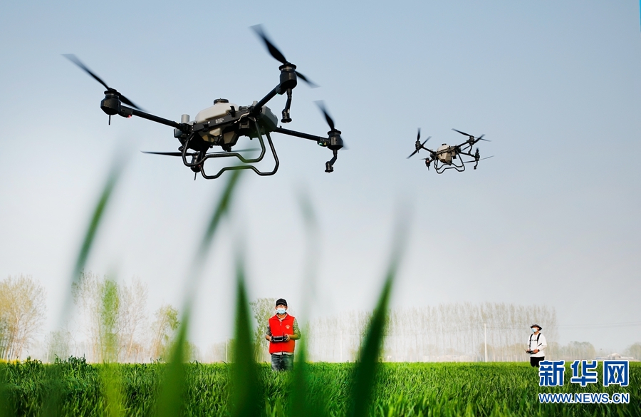 4月7日,河南省開封市尉氏縣南曹鄉馮莊村,植保隊隊員在對小麥田進行“一噴三防”作業。