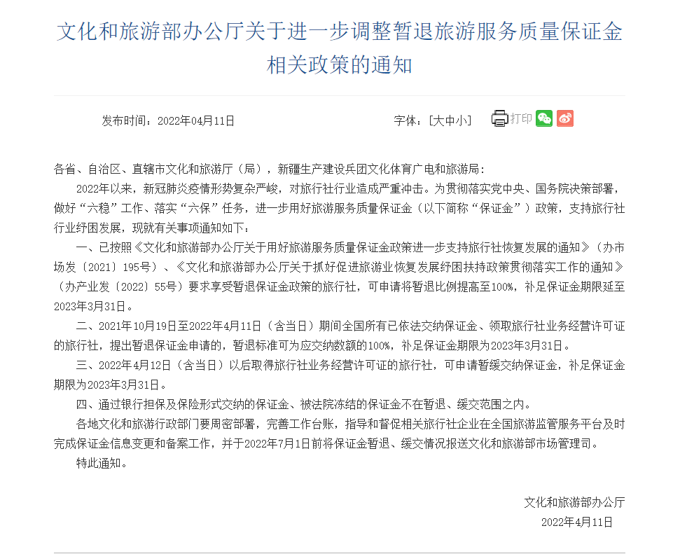 根據文化和旅游部辦公廳11日印發(fā)的通知,為支持旅行社行業(yè)紓困發(fā)展,符合相關條件的旅行社可申請全額暫退保證金或暫緩交納,補足保證金期限延至2023年3月31日。通過銀行擔保及保險形式交納的保證金、被法院凍結的保證金不在暫退、緩交范圍之內。(記者徐壯)