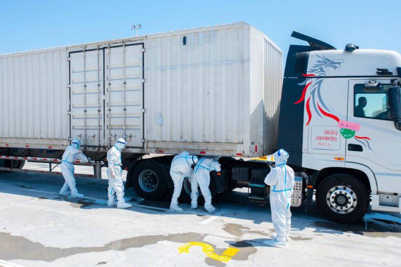 隨后,滿載這些物資包的貨運卡車迅速駛往入滬前的最后一站——浙江省援滬防疫生活物資平湖中轉站。只見貨車駛入后,馬上有身穿防護服的工作人員上前進行登記、消殺;隨后司機將貨車駛入“滿載區”,卸下貨箱;緊接著,接收方的貨車司機將滿載物資的貨箱接走,運往上海市區。