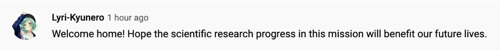 “歡迎回家!希望此次任務(wù)中的科研進展可以造福我們的未來。”