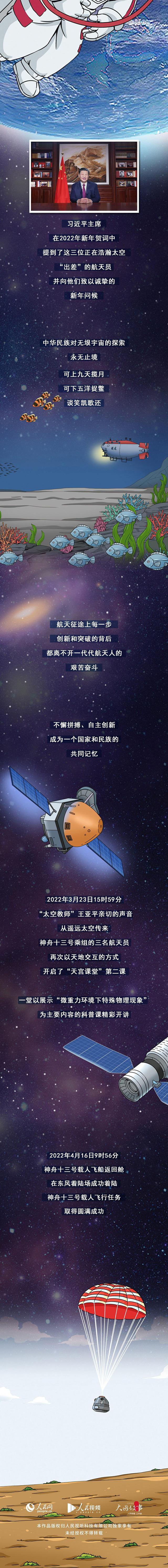 五十一年,從“東方紅一號(hào)”到神州十三號(hào),烙印的是中華兒女對(duì)飛天夢(mèng)的不懈追求。如果說“不知天上宮闕,今夕是何年”記錄著我們的好奇,那“可上九天攬?jiān)隆眲t寄予著我們的夢(mèng)想。 天宮課堂生動(dòng)開講,干貨滿滿,揭曉未知的神秘;航天員們太空出差,妙趣橫生,延展探索的邊界;女航天員王亞平出艙活動(dòng),更是邁出了中國(guó)女性艙外太空行走的第一步。 而今,神舟十三號(hào)返回艙成功著陸,“太空出差三人組”平安歸家。如今精彩圓滿,未來屬于我們!