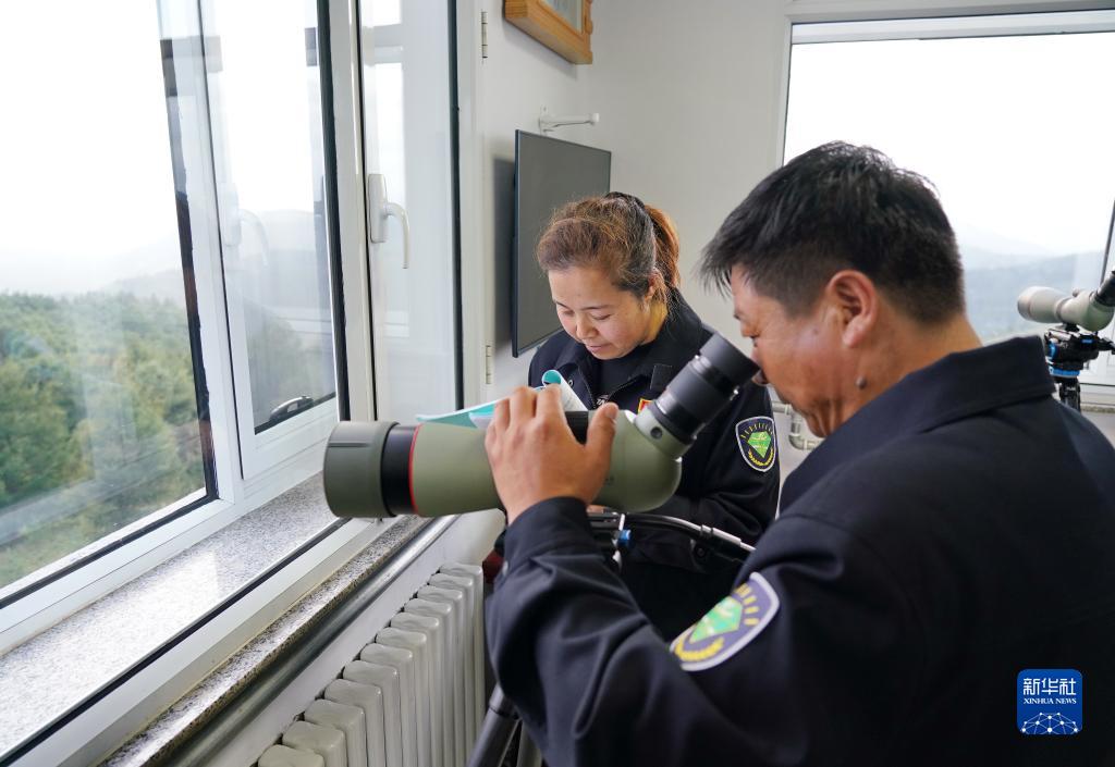 劉軍(前)、王娟夫婦在塞罕壩機械林場月亮山望海樓內瞭望林場(2021年8月23日攝)。新華社記者 牟宇 攝