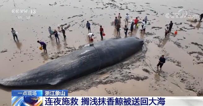 央視網消息:昨天(4月19日)上午,一只擱淺的抹香鯨在浙江寧波象山縣石浦海域被漁民發現,情況非常危險。經過當地多方力量的救援,今天早晨5時20分左右,這頭抹香鯨被成功送回了大海。