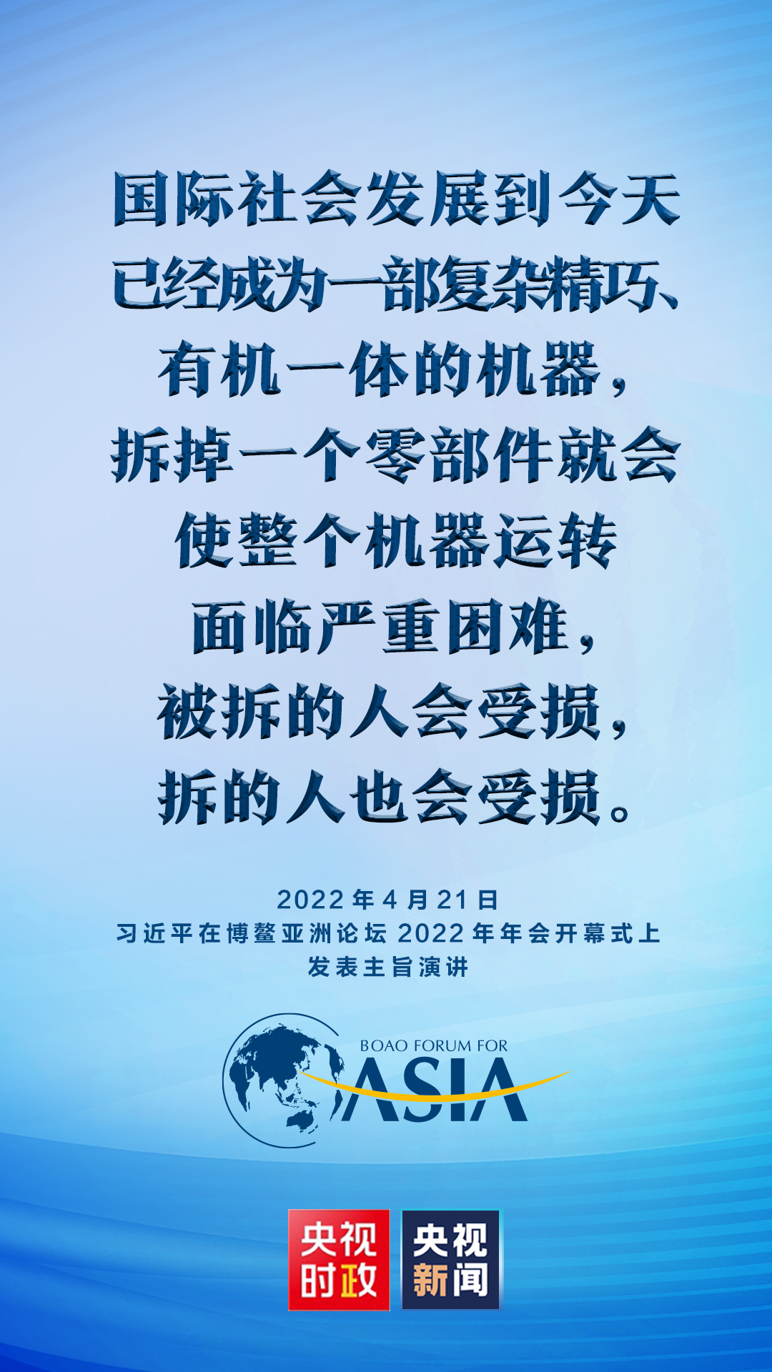 習近平說:“世界各國乘坐在一條命運與共的大船上,要穿越驚濤駭浪、駛向光明未來,必須同舟共濟,企圖把誰扔下大海都是不可接受的。國際社會發(fā)展到今天已經(jīng)成為一部復雜精巧、有機一體的機器,拆掉一個零部件就會使整個機器運轉(zhuǎn)面臨嚴重困難,被拆的人會受損,拆的人也會受損。”