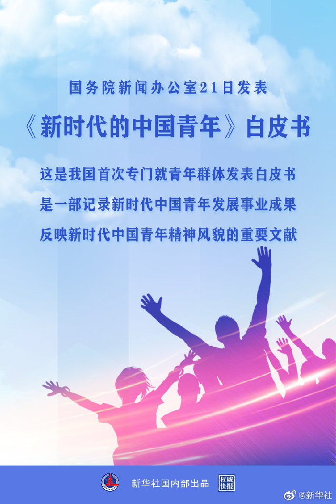 國務院新聞辦公室4月21日發表《新時代的中國青年》白皮書。這是我國首次專門就青年群體發表白皮書。白皮書全面介紹了新時代黨和政府為青年發展創造的良好條件、取得的巨大成就,充分展現了新時代中國青年奮進新征程、建功新時代的青春擔當,是一部記錄新時代中國青年發展事業成果、反映新時代中國青年精神風貌的重要文獻。(記者黃玥、董博婷、張研,海報設計喬昕)