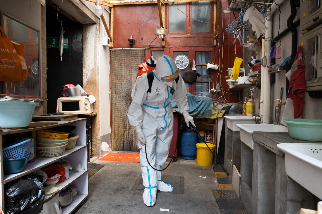 工作人員在黃浦區豫園街道廣福居民區消殺通道(4月19日攝)。新華社記者 金立旺 攝