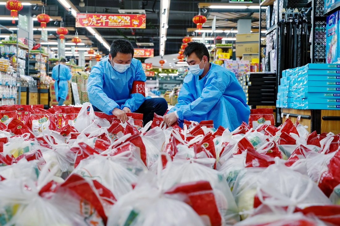 上海市奉賢區西渡街道社區發展綜合服務中心的工作人員入駐超市,承擔分揀配貨等工作(4月17日攝)。新華社發(于薇攝)