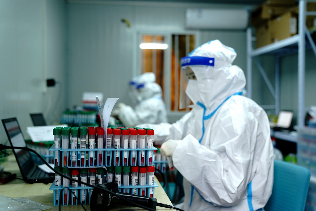 檢測人員在核子華曦核酸檢測方艙實驗室的樣本掃碼間忙碌(4月15日攝)。新華社記者 張建松 攝