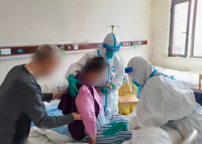 劉奶奶來院時就有腔梗史,右半邊身體不能動,病區的護士們對她的飲食起居都格外留心。馮婷在一次給患者喂飯的過程中發現她一直不太吃得下,原以為是身體不適,檢測后發現,老人的生命體征很平穩。馮婷就讓劉奶奶抱住自己,把她扶坐起來,并像家人一般和她聊天。
