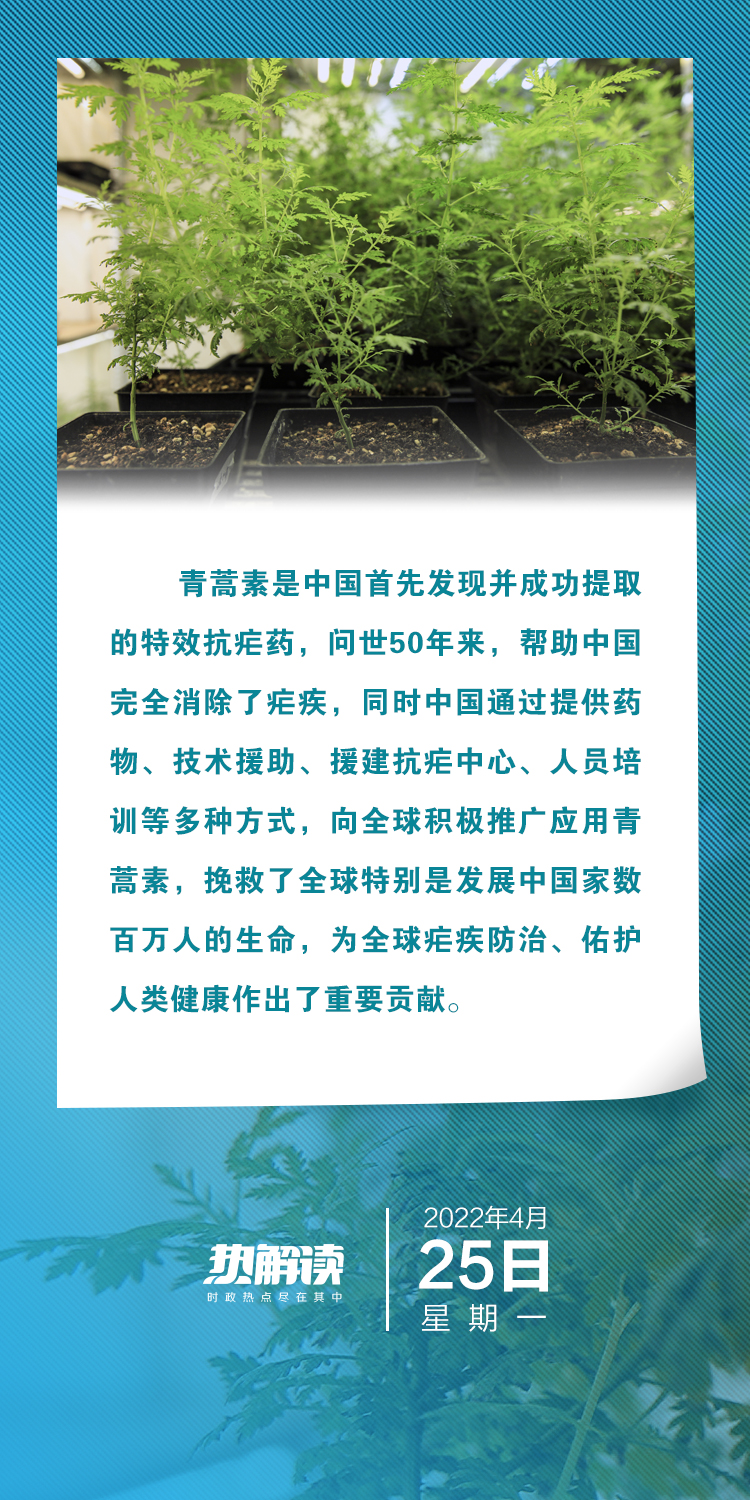 熱解讀4月25日是“世界防治瘧疾日”。習(xí)近平主席向青蒿素問(wèn)世50周年暨助力共建人類衛(wèi)生健康共同體國(guó)際論壇致賀信。