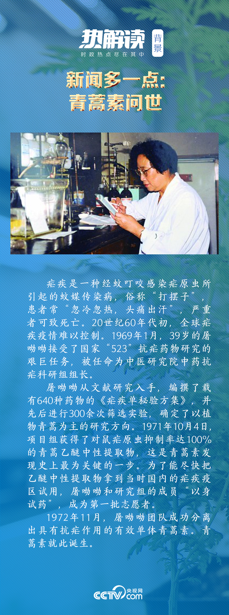 2015年10月,屠呦呦因“從中醫(yī)藥古典文獻(xiàn)中獲取靈感,先驅(qū)性地發(fā)現(xiàn)青蒿素,開(kāi)創(chuàng)瘧疾治療新方法”,獲得諾貝爾生理學(xué)或醫(yī)學(xué)獎(jiǎng)。