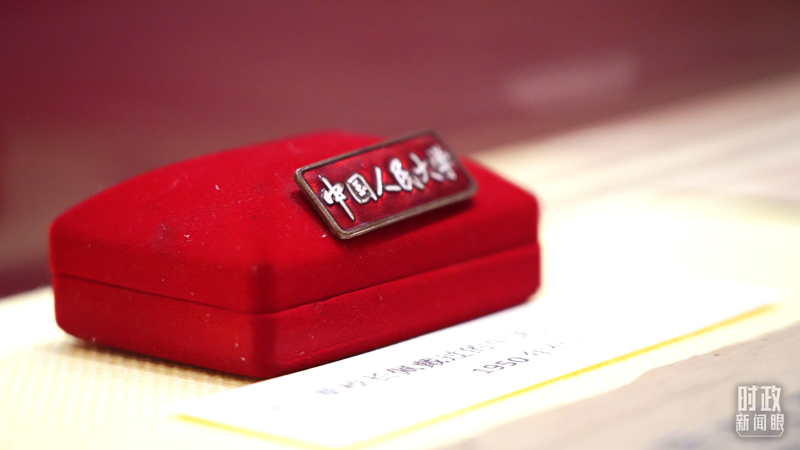 △校史展上,吳玉章校長佩戴過的中國人民大學校徽。(總臺央視記者彭漢明拍攝)