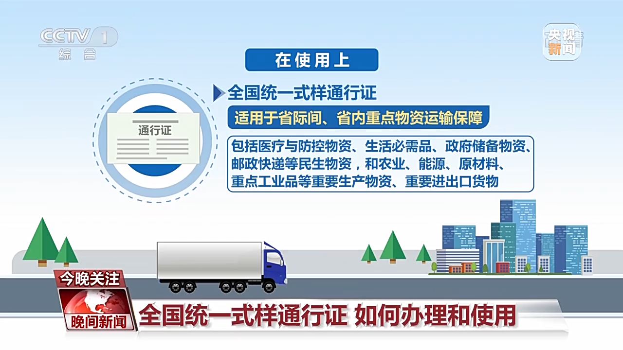 在使用上,全國統一式樣通行證,適用于省際、省內重點物資運輸保障,包括醫療與防控物資、生活必需品、政府儲備物資、郵政快遞等民生物資,和農業、能源、原材料、重點工業品等重要生產物資、重要進出口貨物。對于國內其他地區發放的全國統一式樣通行證的貨運車輛,予以認可。