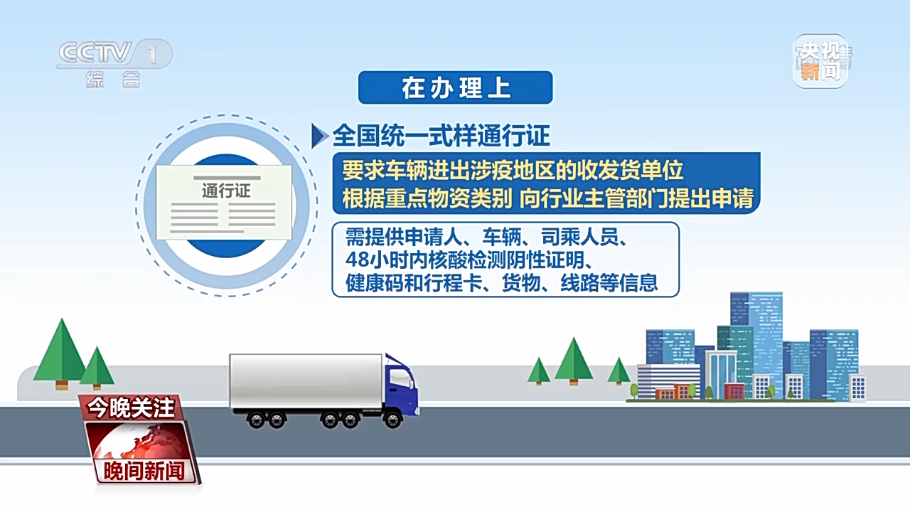 在辦理上,全國統一式樣通行證,要求車輛進出涉疫地區的收發貨單位根據重點物資類別,向行業主管部門提出申請,需提供申請人、車輛、司乘人員、48小時內核酸檢測陰性證明、健康碼和行程卡、貨物、線路等信息。