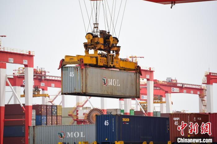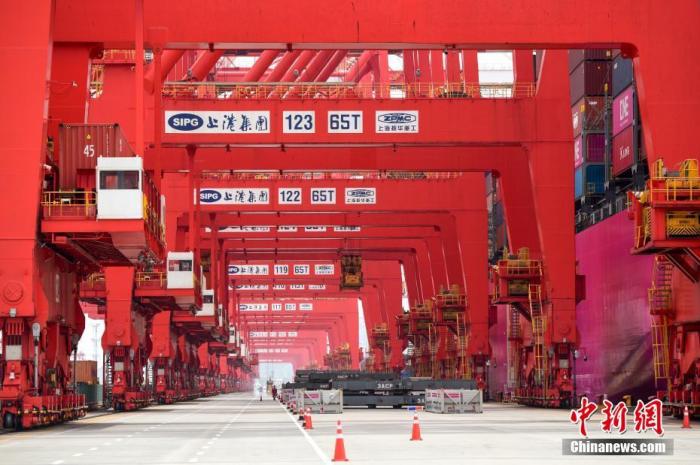 4月27日,上海洋山深水港,岸橋起重機正在裝卸貨物。中新社記者 田雨昊 攝