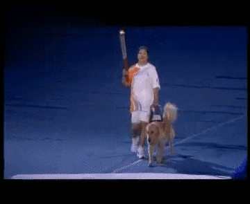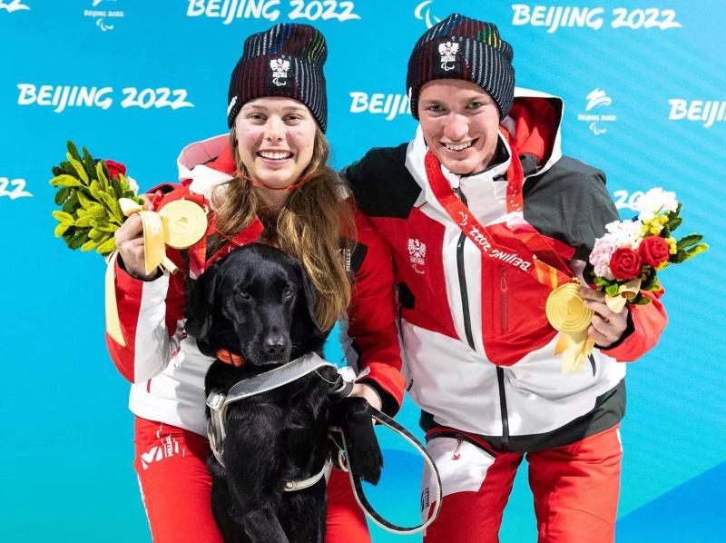 ↑埃德林格(左)與引導員、導盲犬一同站上領獎臺