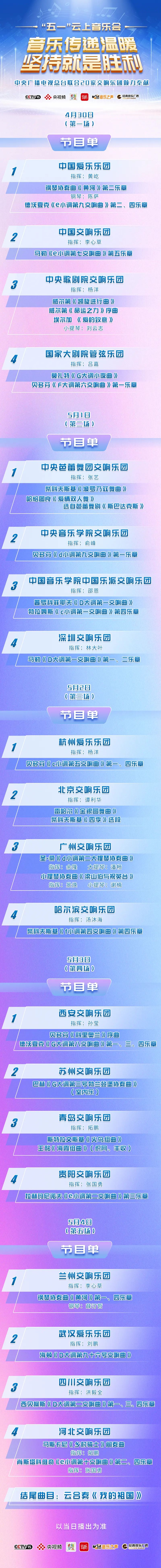 音樂會將于4月30日至5月4日,每天20點在央視頻、央視文藝、云聽客戶端上線,每天21點40分在央視音樂頻道播出。5月1日至5月5日晚間,在央廣音樂之聲、經(jīng)典音樂廣播頻率播出。