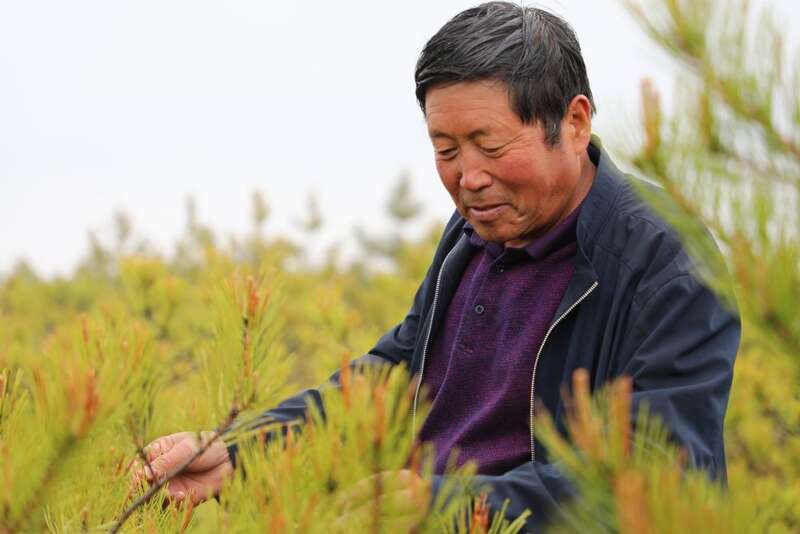 4月15日,吳起群眾李文軍在自己種植的綠林里看苗木長勢。新華社記者梁軍攝