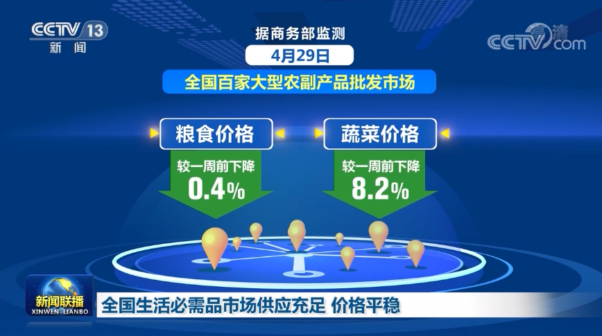 據(jù)商務部監(jiān)測,4月29日全國百家大型農(nóng)副產(chǎn)品批發(fā)市場糧食和蔬菜價格較一周前分別下降0.4%和8.2%。
