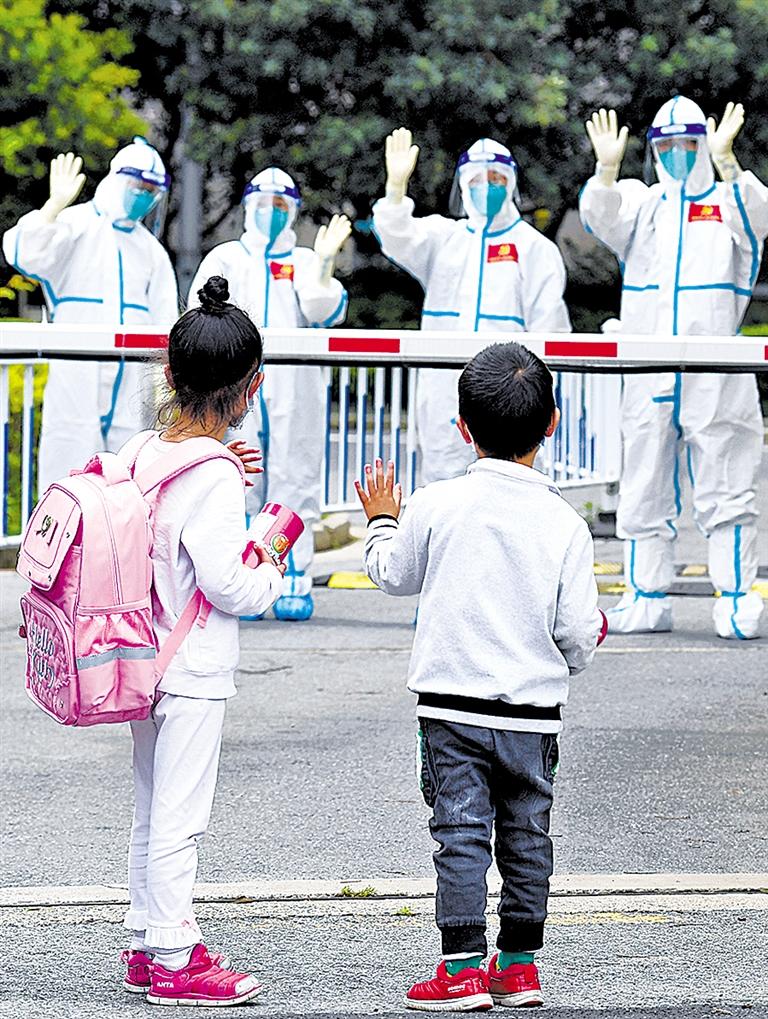 4月30日,走出醫(yī)院準備回家時,小華(右)和姐姐回身向醫(yī)護人員揮手道別。小華(化名)是目前上海新冠定點醫(yī)院出院的最小重癥新冠患者。新華社記者 李 賀攝