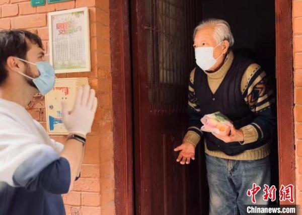 俄羅斯小伙兒matveev(中)在給社區里的老年人派發俄羅斯甜點小禮包 受訪者 供圖