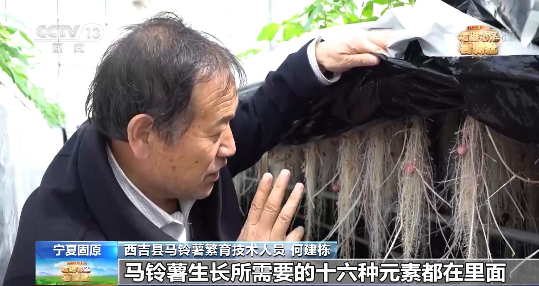 西吉縣馬鈴薯繁育技術(shù)人員 何建棟:全是無(wú)土栽培,這個(gè)里面重點(diǎn)是采用的營(yíng)養(yǎng)液,馬鈴薯生長(zhǎng)所需要的十六種元素都在里面按比例進(jìn)行配比。