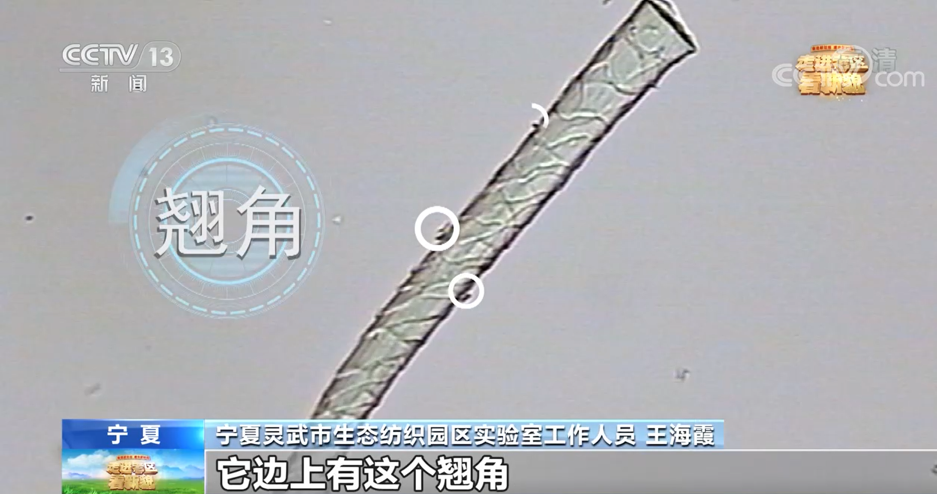 寧夏靈武市生態紡織園區實驗室工作人員 王海霞:羊毛纖維大家看到了,它邊上有這個翹角,貼身穿的話會有刺癢感。那我們現在有一個技術,就是把我們羊毛那個翹出來的角剝掉一點點。(一點點有多少?)0.2個微米,約等于我們頭發(直徑)的三百分之一。