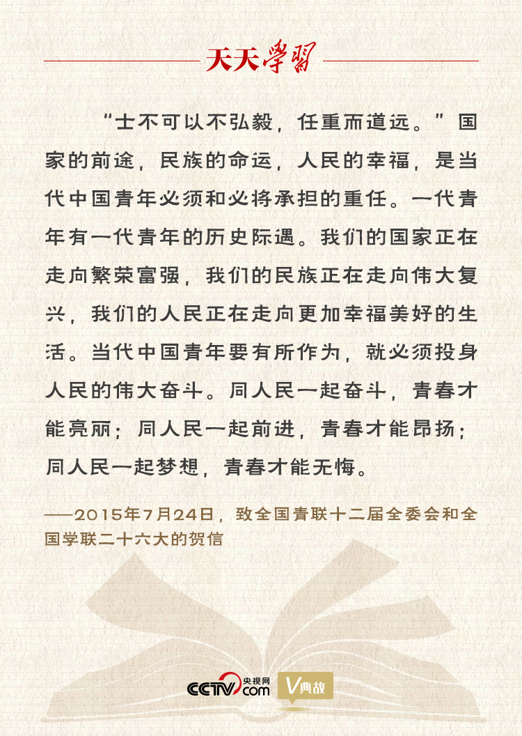 一個有遠見的民族,總是把關注的目光投向青年;一個有遠見的政黨,總是把青年看作推動歷史發展和社會前進的重要力量。我們黨自成立之日起,就始終把青年看作是祖國的未來、民族的希望,始終高度重視青年工作,這是黨永葆青春活力的重要源泉。在黨的領導下,一代又一代中國青年滿懷對祖國和人民的赤子之心,積極投身黨領導的革命、建設、改革開放和現代化建設的偉大事業,為人民戰斗、為祖國獻身、為幸福生活奮斗,把最美好的青春獻給祖國和人民,譜寫了一曲又一曲壯麗的青春之歌。