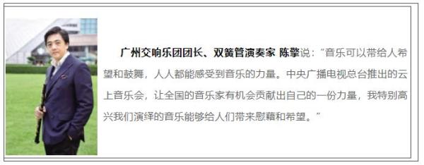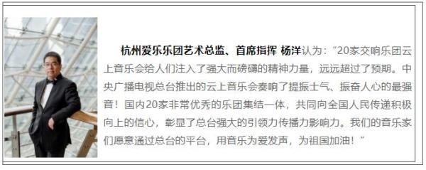 連續(xù)五天的《音樂傳遞溫暖,堅(jiān)持就是勝利——“五一”云上音樂會(huì)》在云端奏響,引發(fā)廣大網(wǎng)友和海內(nèi)外音樂界的高度關(guān)注。“音樂的氛圍和力量讓我一下子淚如泉涌,但又神奇地感覺特別治愈,振奮我的心,期盼勝利的那一刻。”“足不出戶就能享受到頂級(jí)的樂團(tuán)和最優(yōu)質(zhì)的演出!”“音樂曾陪我度過人生很多艱難的時(shí)刻,這次云上音樂會(huì)傳遞溫暖的慰藉,讓我在面對(duì)困難和窘境的時(shí)候多了一份淡然和堅(jiān)定”,央視頻直播頁的留言區(qū)滿滿的都是肺腑之言。