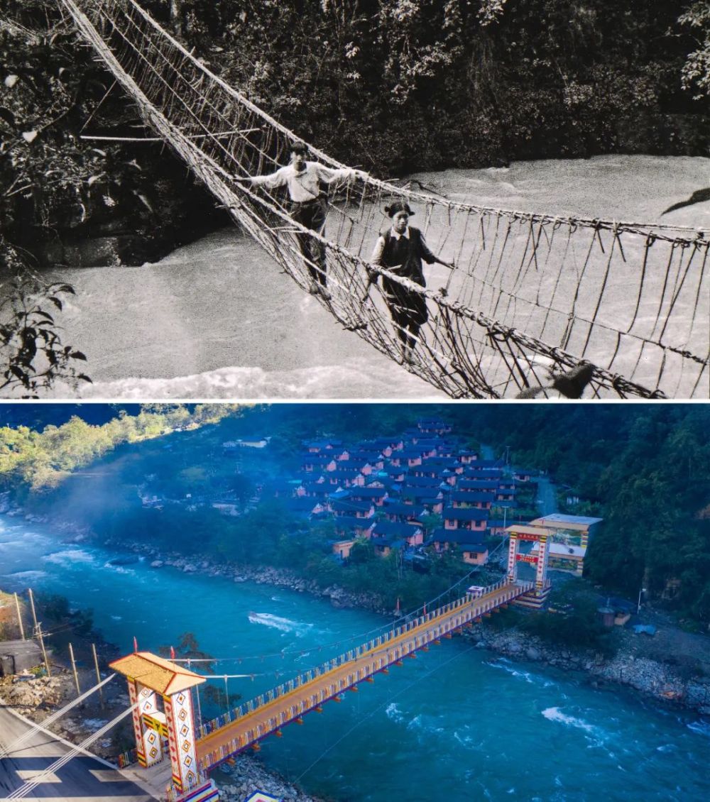 上圖 :獨龍族群眾通過藤篾橋,這樣的橋一直沿用到獨龍江索改橋和公路橋通行以后(資料照片);下圖:獨龍江鄉2020年10月中旬建成通車的白來感恩大橋 胡超攝 / 本刊