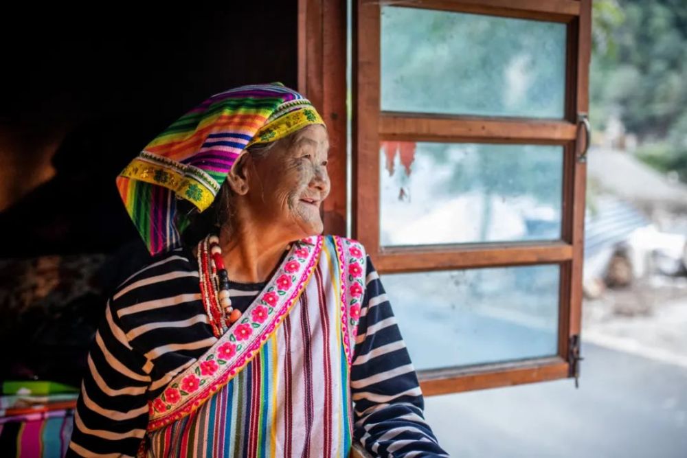 2020年10月27日,云南省貢山獨龍族怒族自治縣獨龍江鄉孔當村,獨龍族“文面女”李文仕在窗邊休息 胡超攝 / 本刊