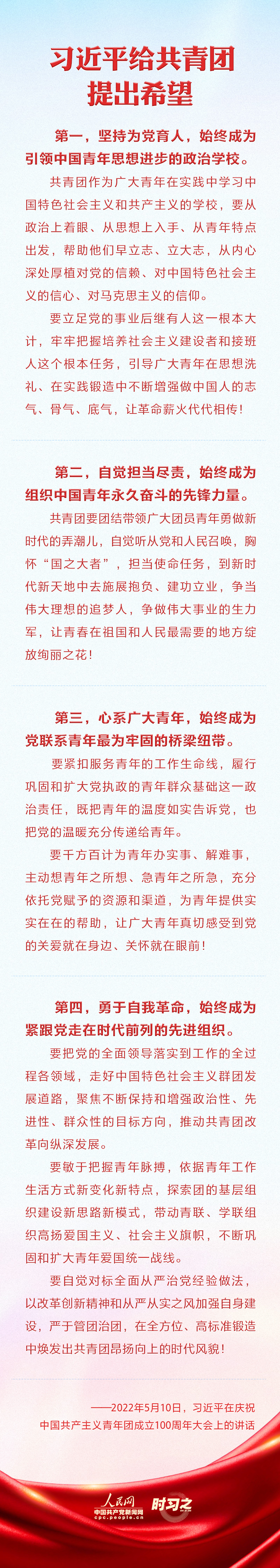 5月10日上午,慶祝中國共產主義青年團成立100周年大會在北京人民大會堂隆重舉行。中共中央總書記、國家主席、中央軍委主席習近平出席大會并發表重要講話。講話中,習近平總書記給共青團、廣大共青團員、廣大團干部提出了希望。