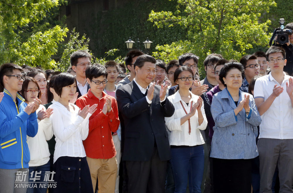 ↑2014年5月4日,習近平在北京大學考察。這是習近平在校園觀看北大師生紀念五四運動95周年青春詩會。