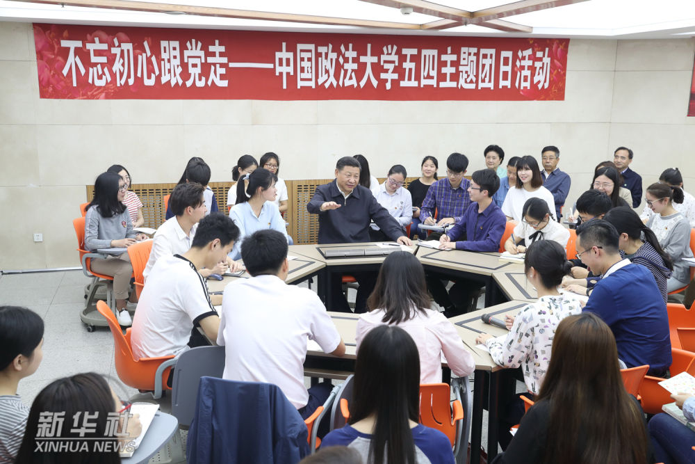 ↑2017年5月3日,習近平來到中國政法大學考察。這是習近平在學生活動中心參加民商經濟法學院本科二年級2班團支部開展的“不忘初心跟黨走”主題團日活動。