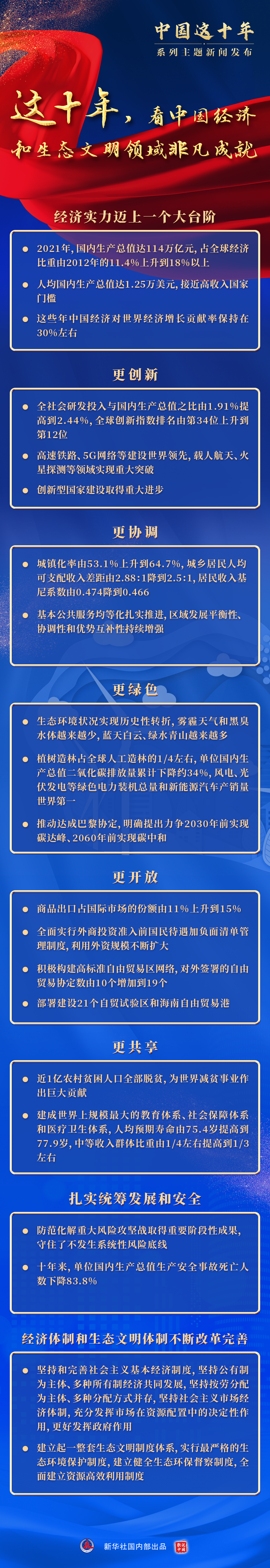 這是我國經(jīng)濟實力又邁上一個大臺階的十年,這是扎實推進(jìn)創(chuàng)新發(fā)展、協(xié)調(diào)發(fā)展、綠色發(fā)展、開放發(fā)展、共享發(fā)展的十年,這是扎實統(tǒng)籌發(fā)展和安全的十年,這是經(jīng)濟體制和生態(tài)文明體制不斷改革完善的十年……
