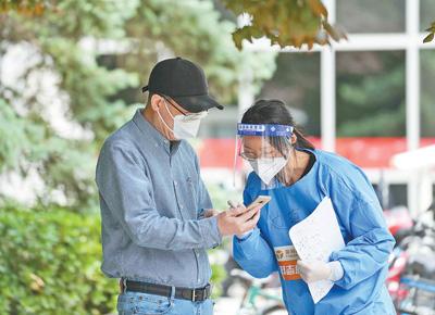 北京市朝陽(yáng)區(qū)建外街道北郎社區(qū)一處核酸檢測(cè)點(diǎn),志愿者邊萌(右)在協(xié)助一名檢測(cè)者掃碼登記。 新華社記者 鞠煥宗攝