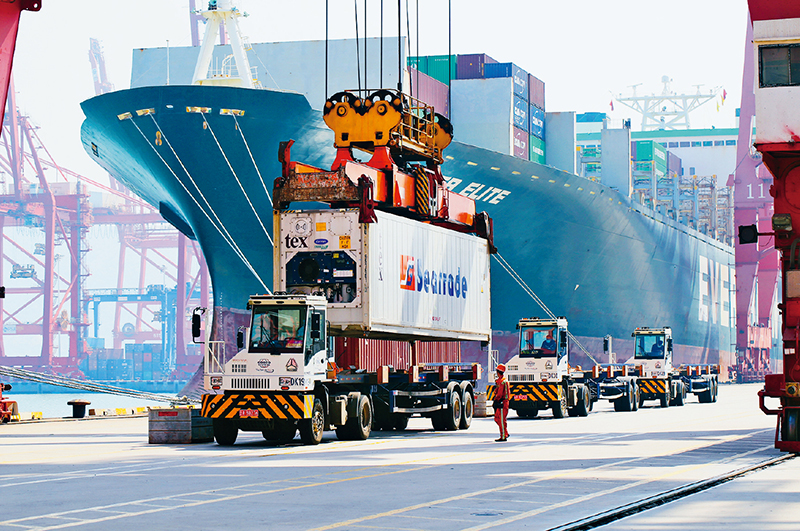 社會主義是干出來的,新時代是奮斗出來的。“五一”假期,許多勞動者堅守崗位,在辛勤工作中度過勞動者的節日。圖為2022年5月3日,在江蘇省連云港港集裝箱碼頭,工作人員為到港貨船卸運集裝箱。 新華社發 王健民/攝