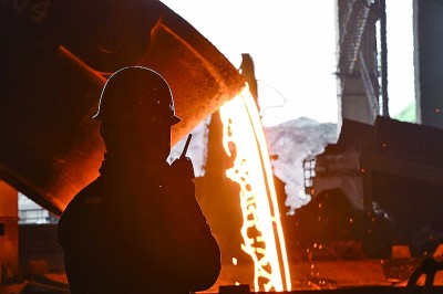柳鋼集團鋼鐵廢渣綜合利用生產車間,青年機械工程師在指揮工人傾倒鋼水。新華社發