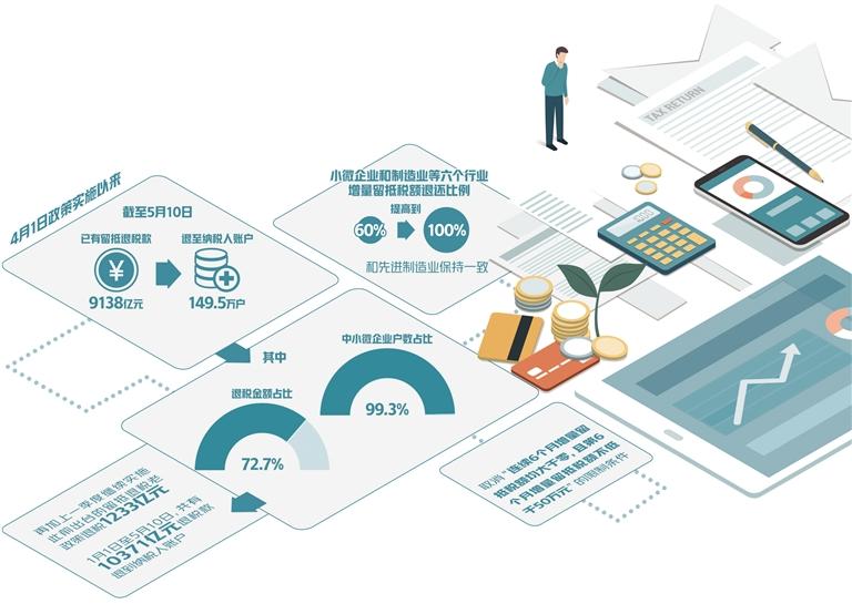 今年增值稅留抵退稅規(guī)模約1.5萬億元。4月1日政策實(shí)施以來,截至5月10日,已有9138億元留抵退稅款退至149.5萬戶納稅人賬戶。其中,中小微企業(yè)戶數(shù)占比99.3%,退稅金額占比72.7%,再加上一季度繼續(xù)實(shí)施此前出臺(tái)的留抵退稅老政策退稅1233億元,1月1日至5月10日,共有10371億元退稅款退到納稅人賬戶,為企業(yè)紓困解難、提振市場主體信心發(fā)揮了重要作用。
