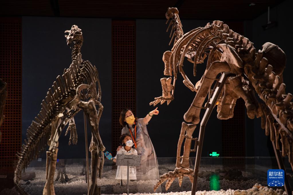 5月17日,家長帶著孩子在南京博物院觀看展出的恐龍化石。