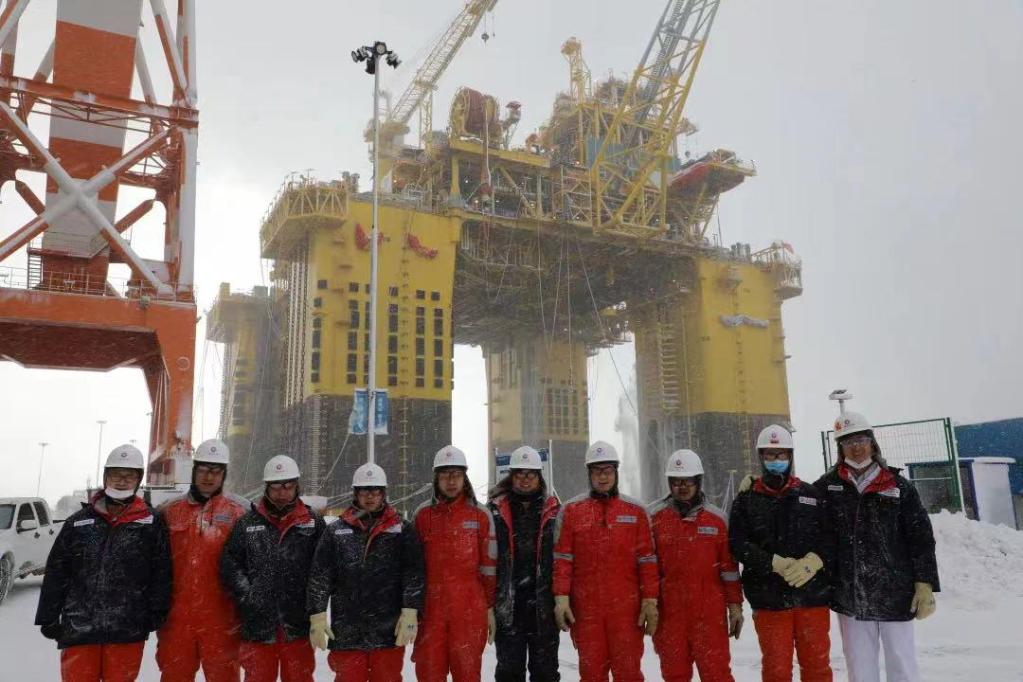 “深海一號(hào)”開(kāi)發(fā)生產(chǎn)團(tuán)隊(duì)在煙臺(tái)建造場(chǎng)地合影。(受訪對(duì)象供圖)