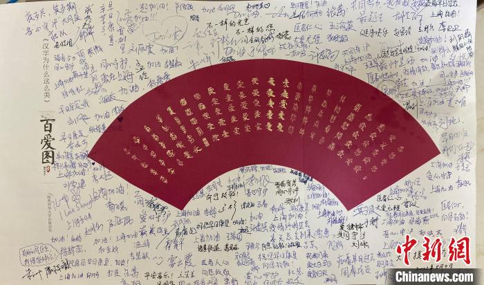在滬期間,山西醫療隊將一幅寫滿全體隊員真摯祝福并親筆簽名的“百愛圖”贈與華山醫院醫護。 華山醫院供圖