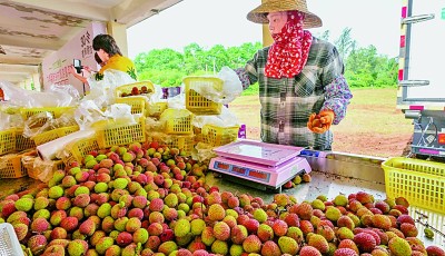 澄邁縣大豐荔枝分揀基地,果農在對荔枝進行分揀包裝。陳元才攝/光明圖片