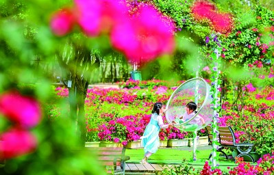 海口市瓊山區紅旗鎮邊洋村三角梅共享農莊內,兩位小朋友正在玩耍。康登淋攝/光明圖片