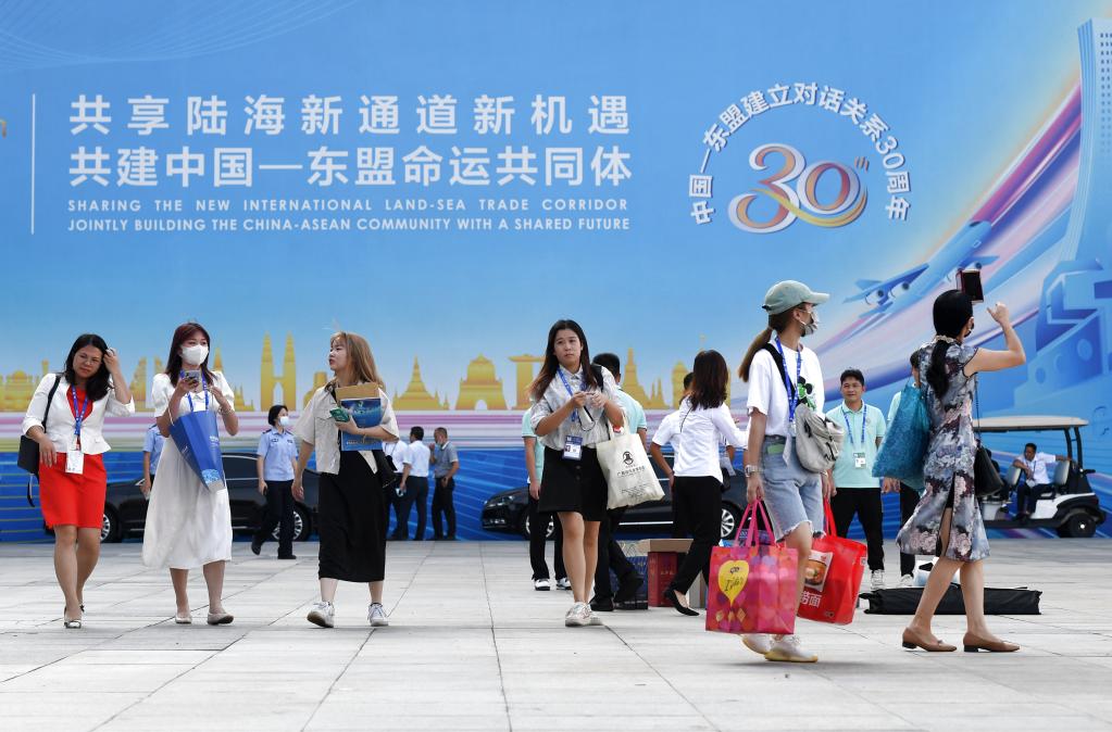 2021年9月11日,在廣西南寧國際會展中心,參觀者走出第18屆中國-東盟博覽會展館。新華社記者陸波岸攝