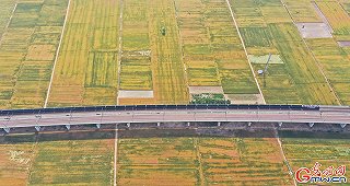 2022年5月27日,位于河南省焦作市武陟縣的黃河灘小麥產區風景如畫、豐收在望。目前正值當地冬小麥澆灌關鍵期,黃綠相間的麥田與川流不息的列車構成了一幅生動活力的美好鄉村畫卷。(王瑋攝/光明圖片)