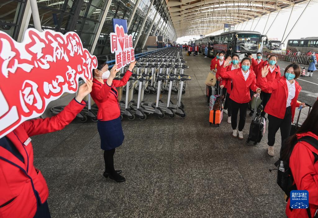 重慶市援滬醫療隊隊員在進入上海浦東國際機場候機樓時向手舉送行標牌的工作人員揮手道別(5月25日攝)。當日,重慶市援滬醫療隊1560余人完成使命撤離上海。新華社記者 李賀 攝